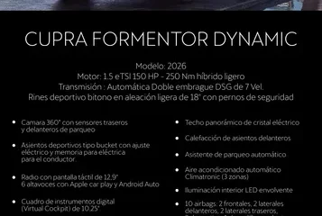 Este Cupra Formentor Dynamic 1.5 eTSI Híbrido es la oportunidad ideal para quien busca un SUV moderno con tecnología de punta y eficiencia en combustible. Con cero kilómetros, es un vehículo nuevo disponible en Suba que combina el dinamismo de la marca con la responsabilidad ambiental. El motor 1.5 de 150 caballos con sistema MHEV entrega 250 Nm de torque a través de la transmisión automática DSG de 7 velocidades, garantizando tanto aceleración como ahorro en el consumo.